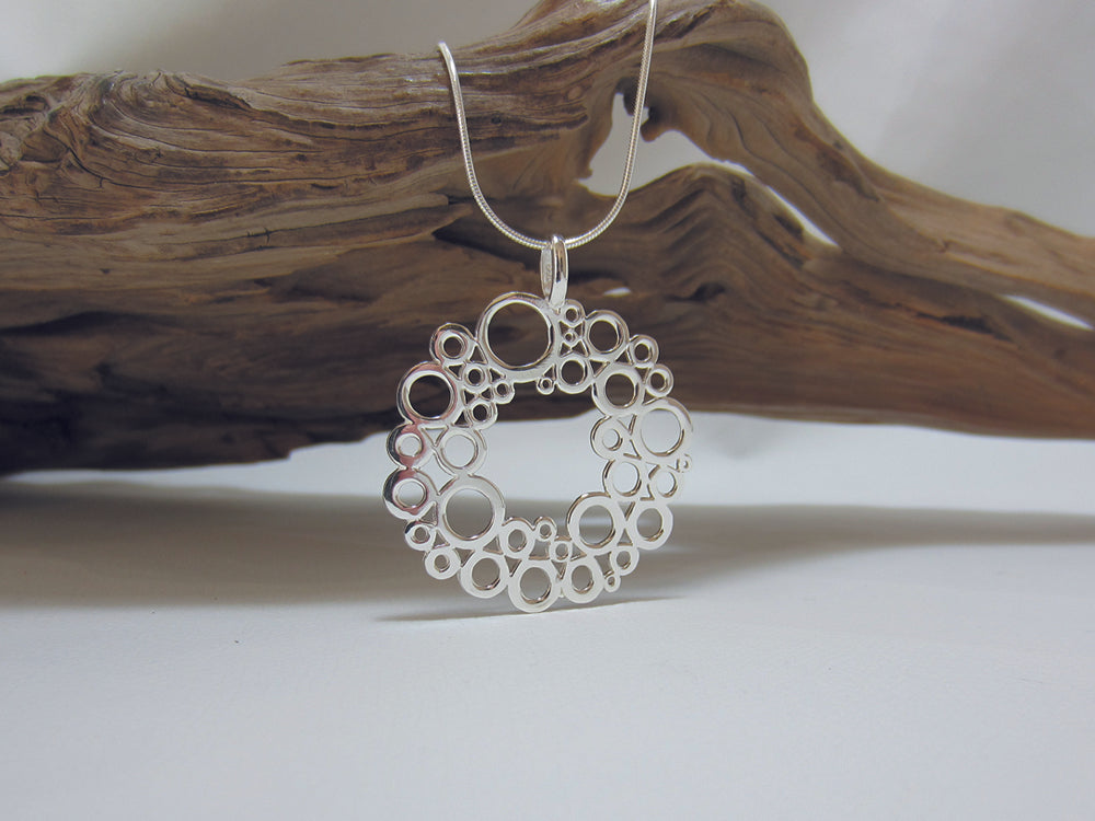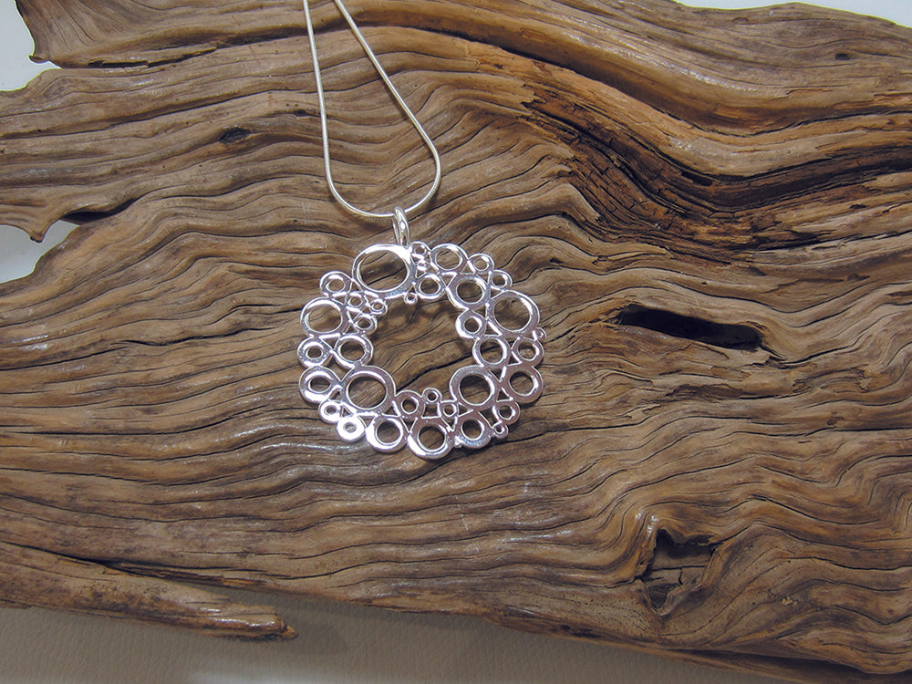 Bubbly style pendant which measures 42mm across. It is shown here of a fine snake chain.