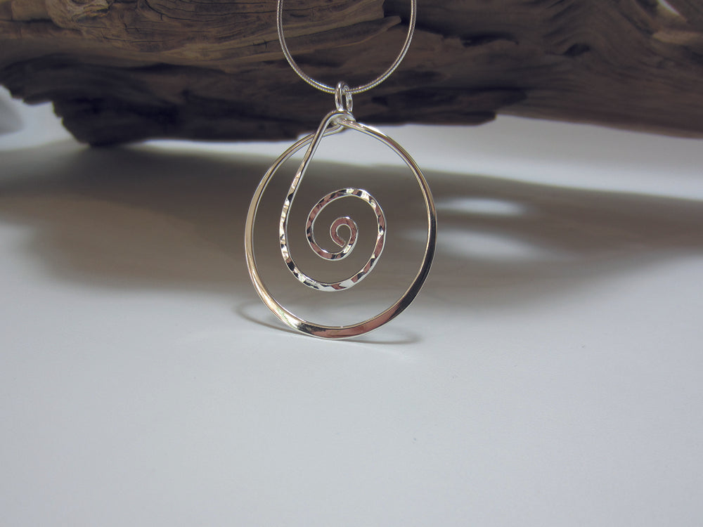 The plain outer circle contrasts nicely with the hammered centre spiral of this pendant which is 37mm in diameter. It is pictured here on a fine snake chain.
