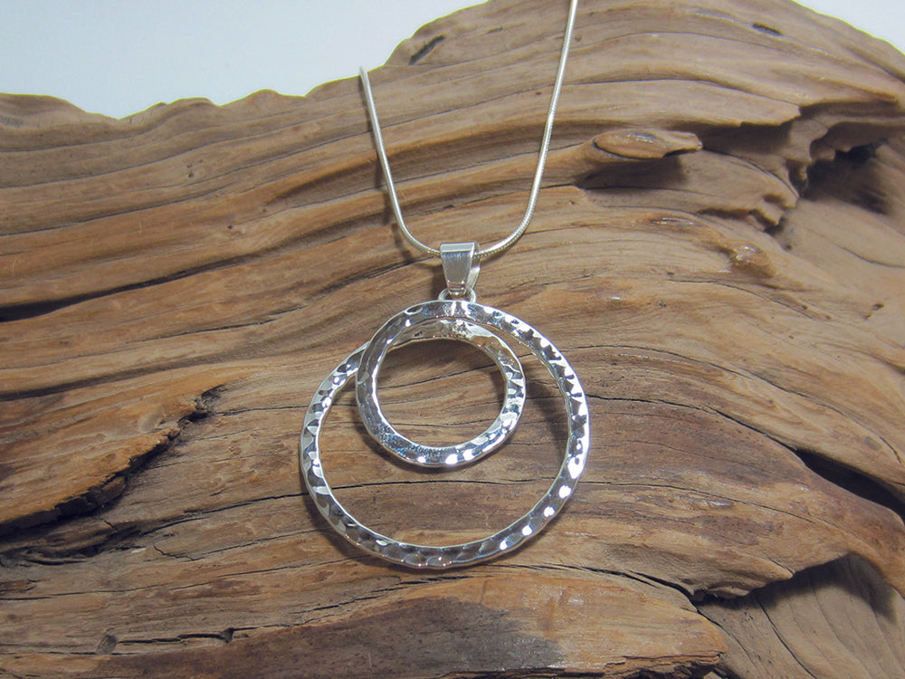 A bold hammered spiral pendant which measures 36mm across. It is shown here on a fine snake chain