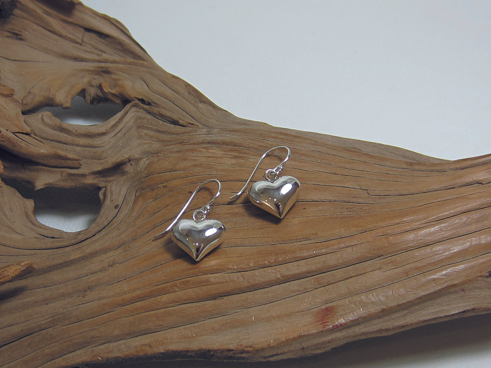 Completely plain silver puffed heart drop earrings. They are 15mm wide.