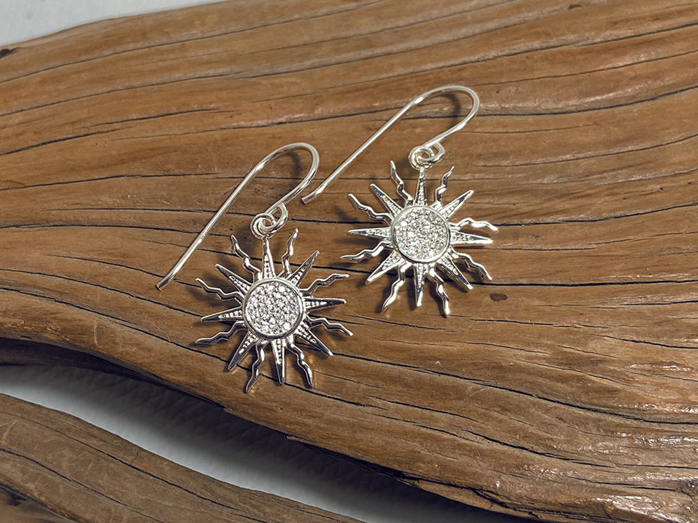Eye catching sun design with microset cubic zirconia. Each earring measures 20mm across.